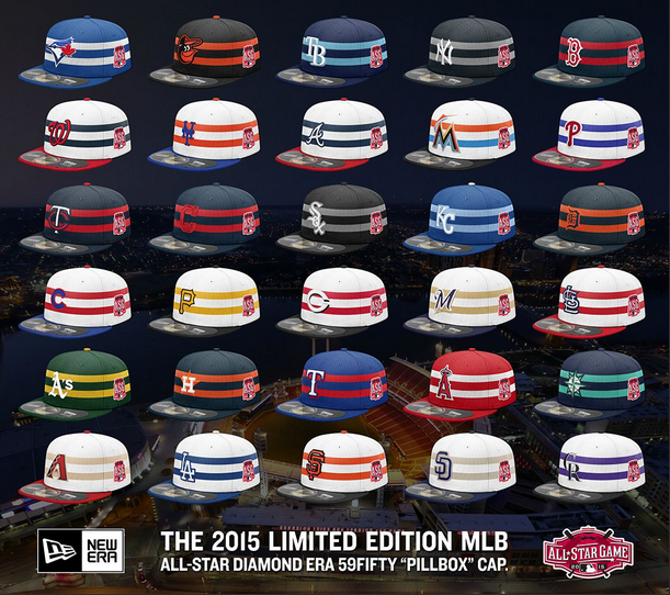 Major League baseball and New Era Caps unveiled the 2015 All-Star Game cap collection with a graphic showing the design that players of each MLB team will wear. The design features two horizontal stripes as a tribute to the Reds’ historical pill box design.